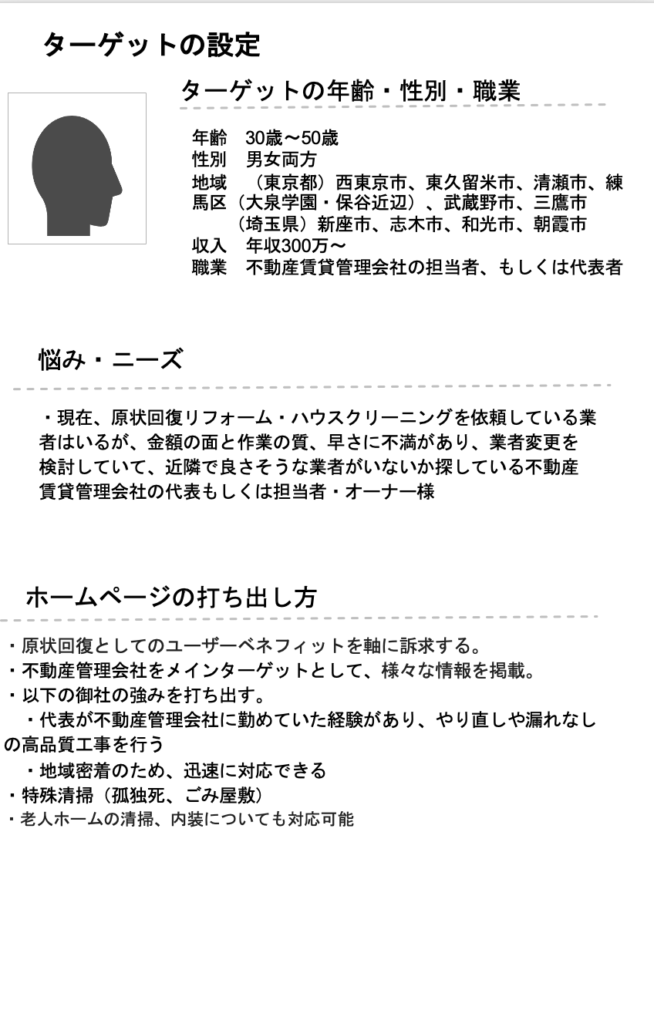 ターゲットの設定、ページの構成案の作成(何ページ作るか、どんな内容にするか、など)を詳しく詰めていきます。