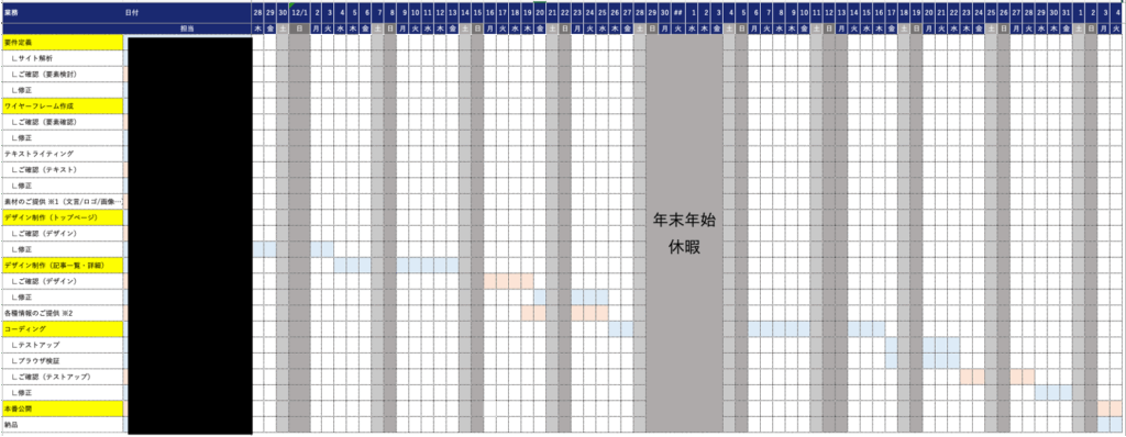 多くの場合、写真のような工程表を作成して、どの期間にどの作業を行うかをディレクターが整理します。
